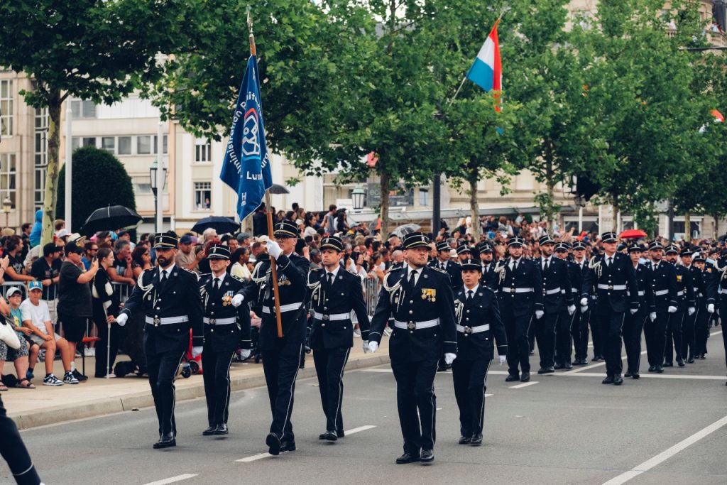 Le corps de surveillance était représenté par 86 agents pénitentiaires issus des trois centres pénitentiaires du pays : le Centre pénitentiaire d’Uerschterhaff, le Centre pénitentiaire de Luxembourg et le Centre pénitentiaire de Givenich. Les agents ont défilé en portant leur nouvelle tenue de cérémonie : un uniforme bleu foncé composé d’un pantalon, d’une veste ornée de la fourragère, d’une chemise blanche, d’une cravate et d’un képi. Les stagiaires portaient quant à eux la tenue de service introduite en 2024, avec un pantalon bleu foncé, une chemise claire, une fourragère assortie au design de l’emblème et un béret orné. Enfin, les maîtres-chiens étaient habillés de leur tenue d’intervention.